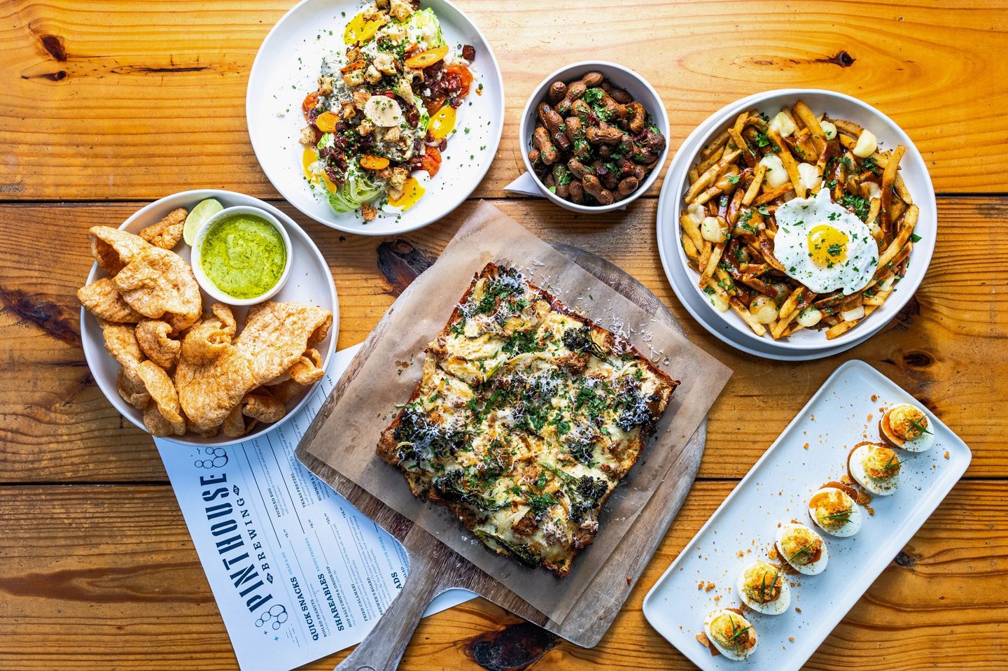Fall seasonals at Pinthouse Brewing: Chicharrónes, Winter Wedge Salad, Low Country Boiled Peanuts, Poutine, and Deviled Eggs. (Photo by Richard Casteel)